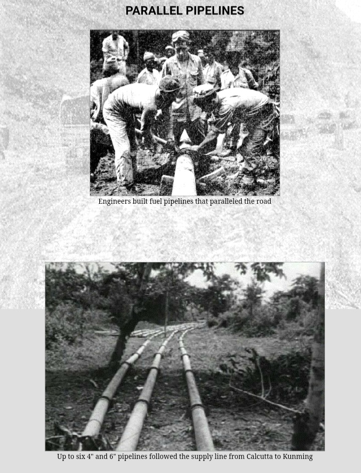 1942年9月,盟军总部下令史迪威着手部署缅北反攻军事行动,并落实“雷多公路”(英文 Ledo Road ),亦称“中印公路”)的修筑工程,路线锁定由印度东北部阿萨姆邦的雷多小镇(Ledo)为西端起点,穿越缅北地区人烟稀少的蛮荒密林,直达云南边陲小镇畹町,于此衔接旧有的滇缅公路,再通往东端终点的昆明。施工部队还同步铺设两条与公路平行的输油管道,主要为了供给飞机和车辆所需的大量动力油料。
