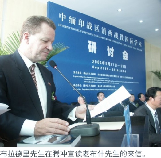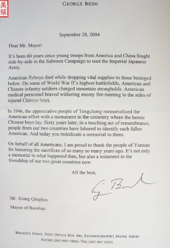 2004年9月14日是中国远征军收复腾冲60周年纪念日,当地举办了一系列的盛大活动。美国著名作家詹姆斯·布拉德里(James Bradley),受邀出席了其中一项意义重大的纪念碑揭幕仪式,该纪念碑是专为19名在腾冲战役中不幸阵亡的美军官兵而立。他当众宣读了老布什前总统致函云南人民的感谢信。人在现场的戈叔亚感到格外的欣慰,为了这批阵亡美军官兵名录的查证、与布拉里德的密切联系、老布什来信内容的草拟等诸多方面的落实,都是经由他在幕后默默付出了不少心血。
