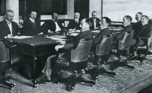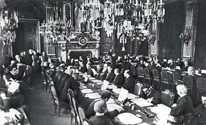 美国总统在会前提出十四点的和平原则,包括废除秘密条约、平等对待殖民地人民、成立国际联盟等倡议,参议各国表达了认同。