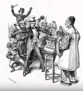注 1 :不过,由于美国国内对华工的激烈排斥,美国在1880年修改了《蒲安臣条约》中的移民条款,又于1882年通过了《排华法案》。