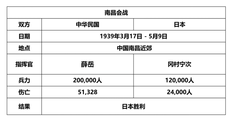 1939年春季,日军向南昌发动攻势,竟然使用毒气以突破国军的防线。南昌于3月27日沦陷,国军随后屡次反攻皆告失败。此役于5月9日结束,战事持续长达54天,史称“南昌会战”。