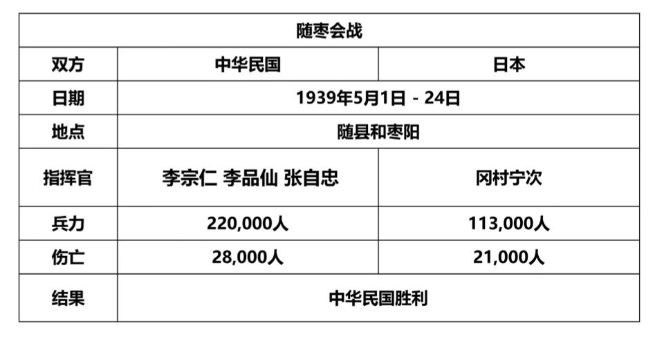 1939年5月1日,日军又向湖北地区发动进攻,目的主要是为了消除武汉周边地区的国军威胁。国军于战役中先是顽强防守却告失败,后续又回旋反攻。战事持续至23日,国军相继收复枣阳和随县等地。此役最终以日军撤退,战线恢复之前的状态而结束。客观来看,日军此役的战略显然受挫,史称“随枣会战”。