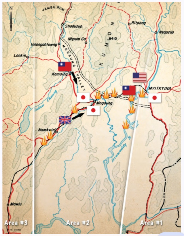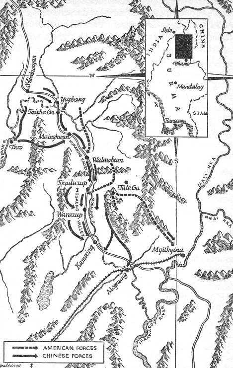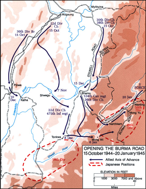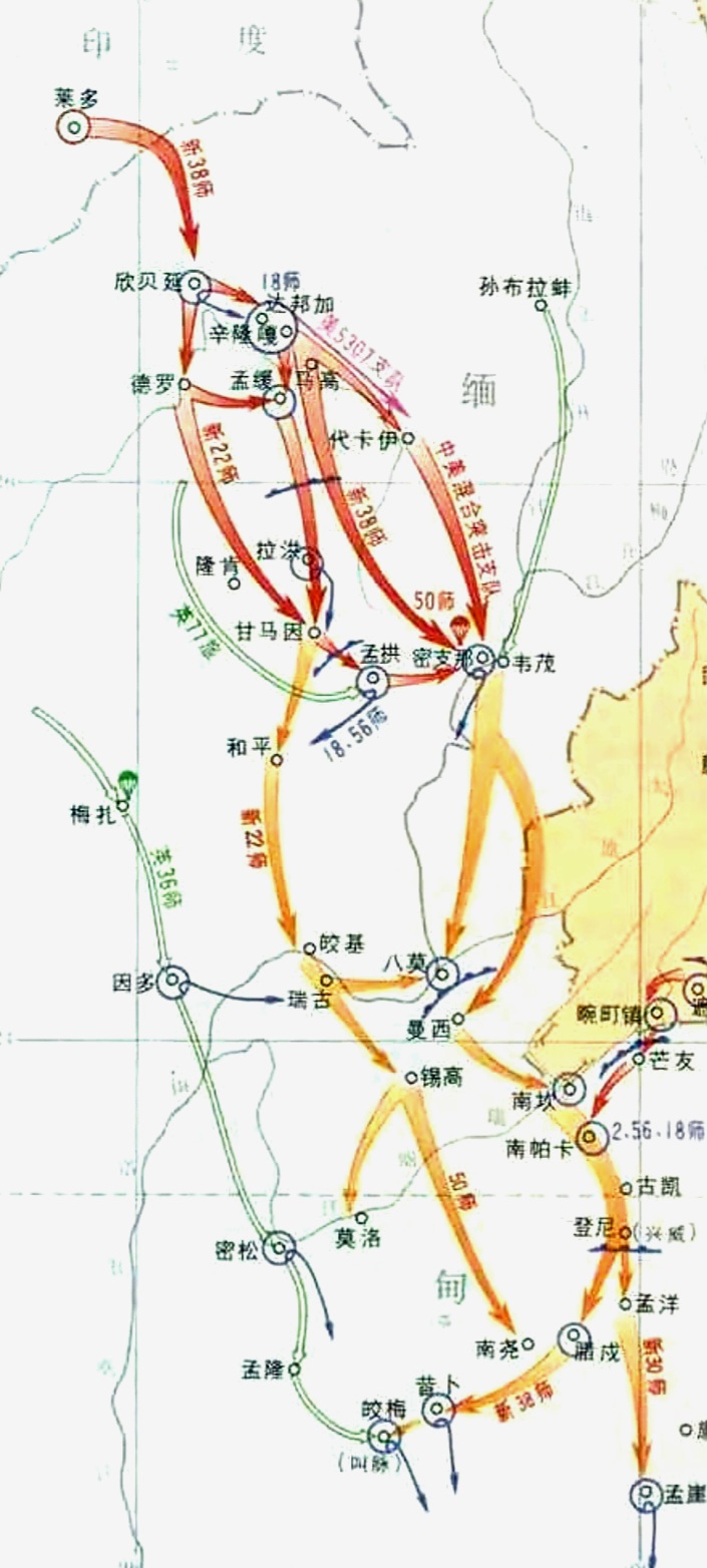 回溯缅北反攻战的第二阶段,始于1944年10月9日。盟军自密支那出征后,如上所述,新一军新30师和新38师沿东线作战,接连攻占了八莫、南坎和芒友等地。