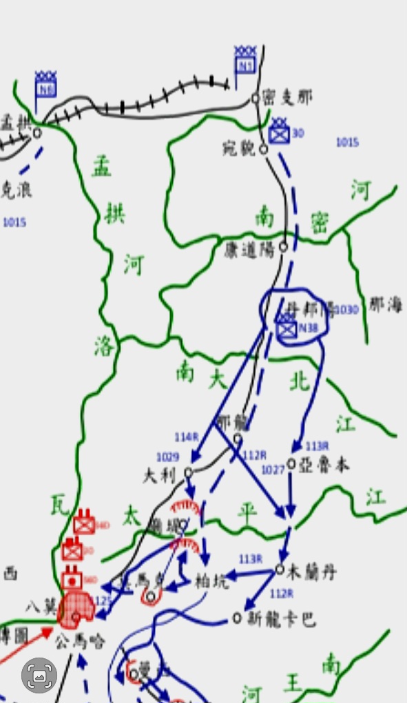 11月3日,新38师先期以一部兵力从江北佯攻,主力部队则隐蔽转移至左侧山地,沿不兰丹(Brendan)、龙卡巴(Longkaba)等村庄迂回向八莫、曼西(Mansi)挺进。