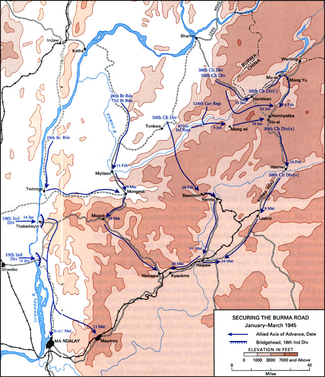 芒友胜利会师后,盟军于1945年2月23日兵分三路,乘势向瑞丽河以南的日军发动追击:东线的新一军新38师,自南坎沿旧有的滇缅公路直取腊戌(Lashio); 中线的新六军第五十师,自锡高经南都(Namtu)、西保(Hsipaw)向皎梅(Kyaukmei)进发;西线的英军第36师,自密松(Myitson)沿伊洛瓦底江东侧向芒密特(Munmit)进发。