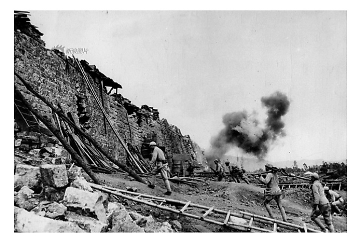 1944年8月4日,14 AF出动32架飞机,投下20余枚的重磅炸弹,将腾冲城墙炸开两大缺口,同时又投下燃烧弹,引发城内大火燃烧。远征军第36师107团的士兵,快速在城墙缺口架上云梯,英勇攀登而上攻入城内。